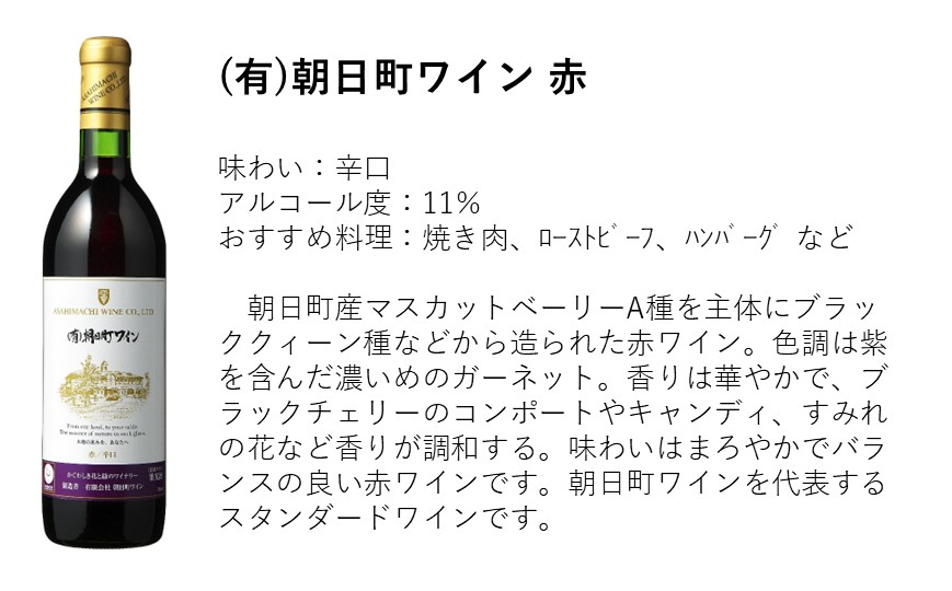 朝日町産マスカットベーリーA種を主体にブラッククイーン種などから造られた赤ワイン。色調は紫を含んだ濃いめのガーネット。香りは華やかで、ブラックチェリーのコンポートやキャンディ、すみれの花などの香りが調和する。味わいはまろやかでバランスぼ良い赤ワインです。朝日町ワインを代表するスタンダードワインです。