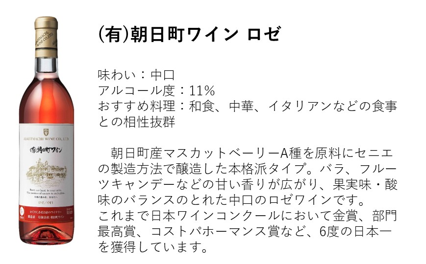 朝日町産マスカットベーリーA種を原料にセニエの製造方法で醸造した本格派タイプ。バラ、フルーツキャンデーなどの甘い香りが広がり、果実味・酸味のバランスのとれた中口のロゼワインです。和食、中華、イタリアンなど食事との相性抜群です。朝日町を代表するロゼワインで、これまで日本ワインコンクールにおいて金賞・部門最高賞、コストパホーマンス賞など、6度の日本一を獲得しています。