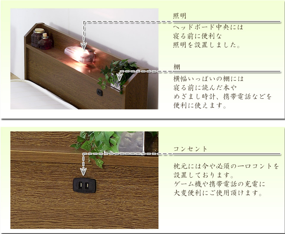 ヘッドキャビネットにライトとコンセントが付いて、更にフレームは安心の日本製!