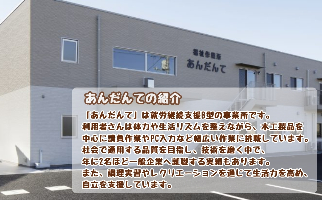 この木工品は、障がい者就労継続支援B型事業所「あんだんて」の方々が協力して製作しました。