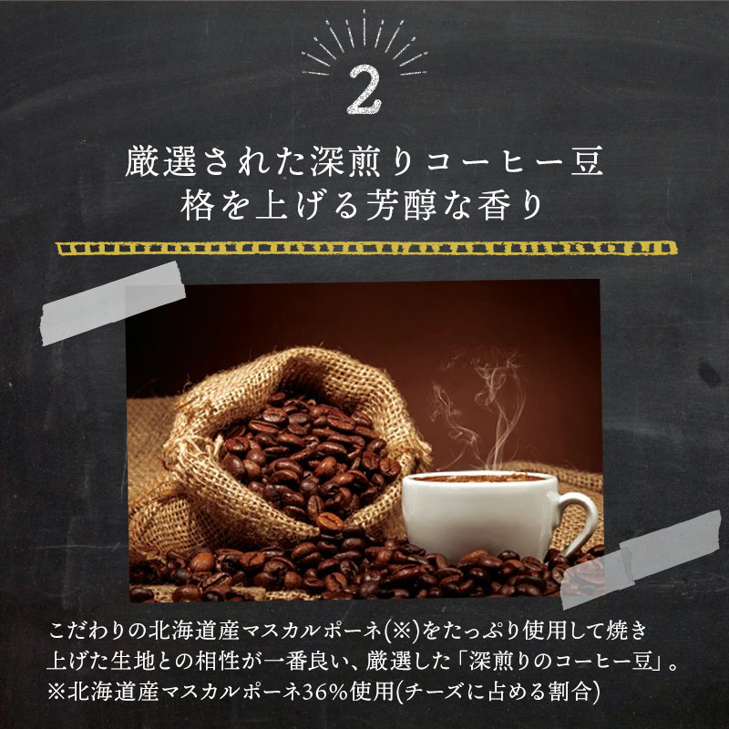こだわりの北海道産マスカルポーネと北海道産小麦を使用したスポンジに、ほろ苦いコーヒーシロップを一つ一つていねいに染み込ませました。