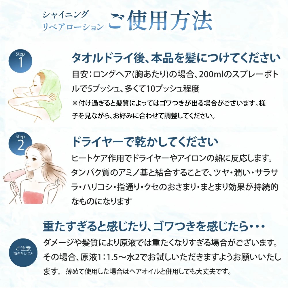 ■シャイニング リペアーローション 成分:水、グリセリン、PPG-2、γ-ドコサラクトン、メドウフォーム-δ-ラクトン、ポリクオタニウム-61、加水分解ケラチン(羊毛)、加水分解コラーゲン、ヒアルロン酸Na、ヒアルロン酸ヒドロキシプロピルトリモニウム、シスチン、白金、カルボキシメチルキトサンサクシナミド、ジヒドロキシプロピルアルギニンHCl、コハク酸ビスエトキシジグリコール、ジステアリルジモニウムクロリド プラマーク、ベヘントリモニウムクロリド、フィトステロールズ、ココイルアルギニンエチルPCA、トリ(カプリル酸/カプリン酸)グリセリル、PEG-40水添ヒマシ油、PPG-8セテス-20、プロパンジオール、セルロースガム、トコフェロール、炭酸水素Na、クエン酸Na、BG、乳酸、フェノキシエタノール、メチルパラベン、香料