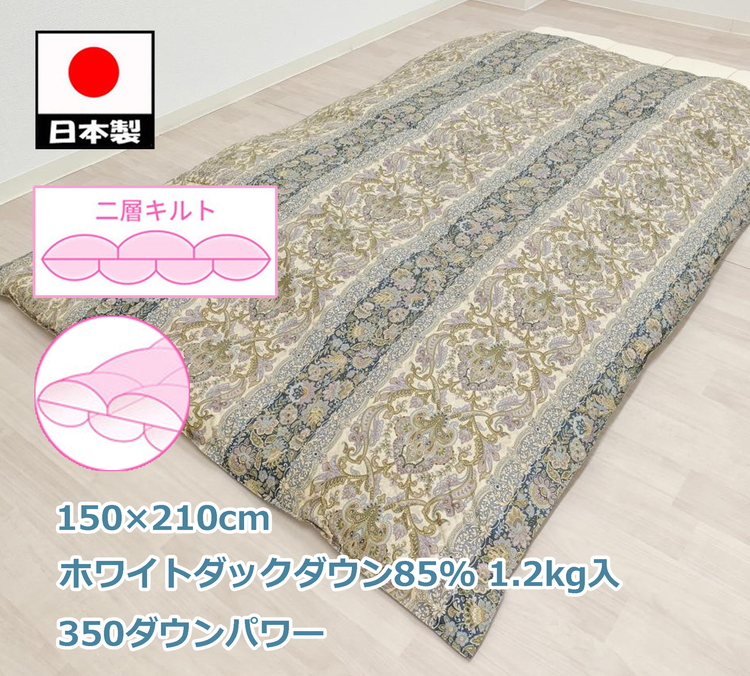 高熱で攪拌する「パワーアップ加工」と除塵しながらの「オゾン加工」を施した350ダウンパワー以上の良質なホワイトダックダウン85%が1.2kgも入れてあり、とてもふわふわで暖かいです。