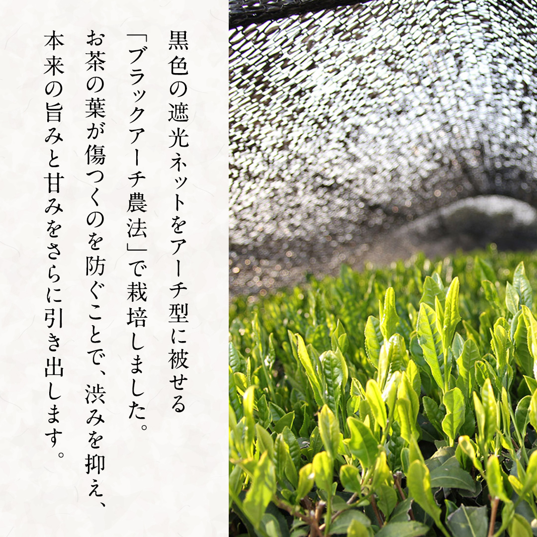 「ブラックアーチ農法」で栽培しました。ブラックアーチ農法とは黒色の遮光ネットをアーチ型のパイプの上から被せることで、お茶の葉が擦れて傷つくのを防ぐとともに、お茶の持っている濃厚な旨み、甘みをさらに引き出し、渋みを抑えることができる農法となります。