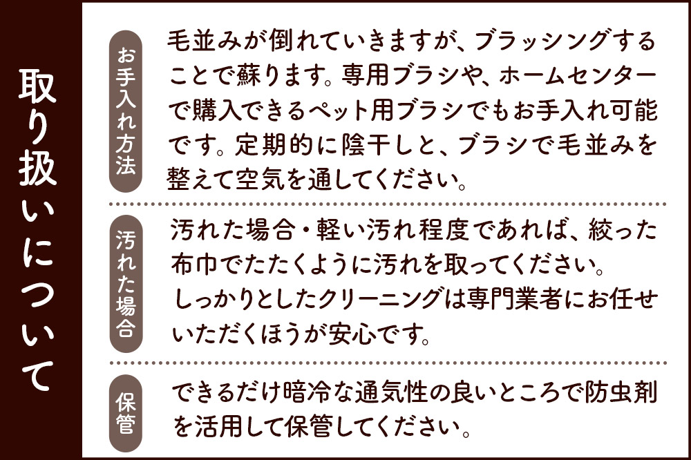 ■保存方法:(1)お手入れ方法:毛並みが倒れていきますが、ブラッシングすることで蘇ります。専用ブラシ、ペット用ブラシでお手入れ可能です。定期的に陰干しと、ブラシで毛並みを整えて空気を通してください。