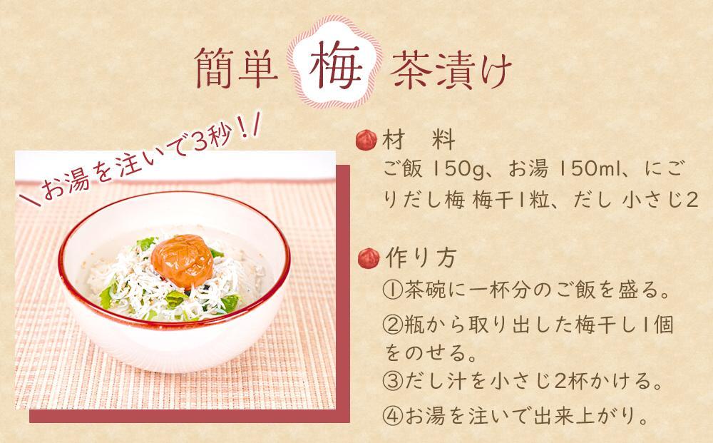 昆布をベースに鰹節とホタテが加わりうま味が凝縮されただしをお楽しみください。お茶漬け以外にも納豆やそうめん、からあげなどの調味料としてお使いいただけます。