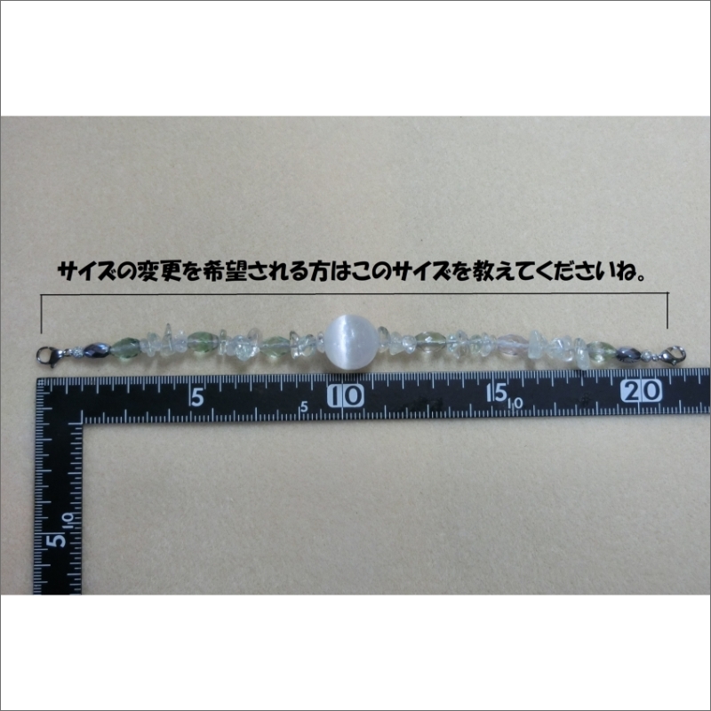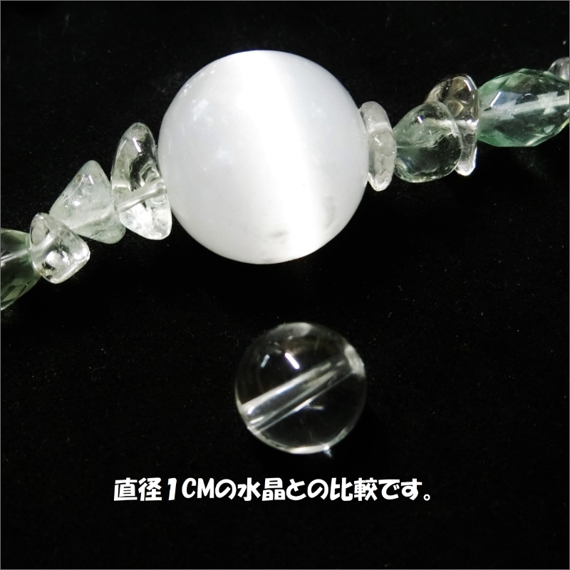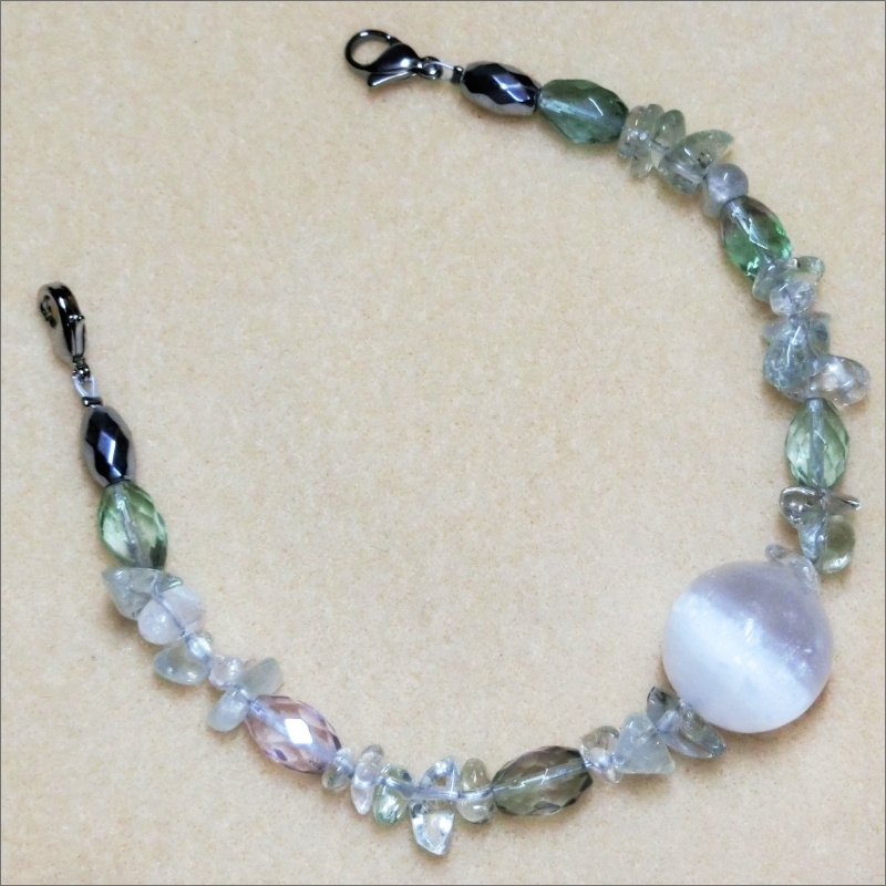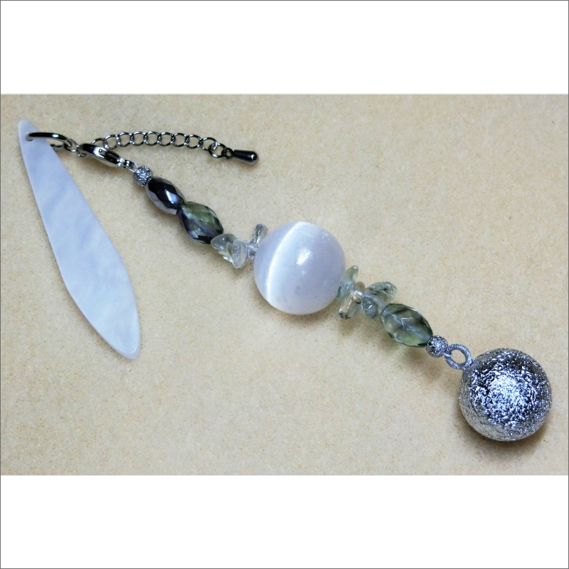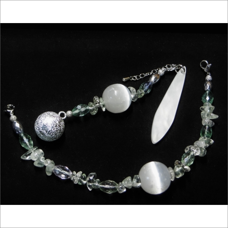 中央に大きく白い「セレナイト」は非常に柔らかい石で、水や湿気、人の油脂が苦手な為、装飾品には向かない石なのですが、美しさと清らかさを表現するために、あえて使用いたしました。