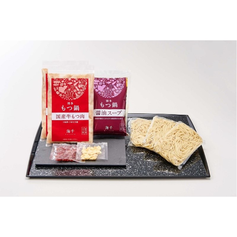 スープの決め手となる醤油には海千の地元宗像産大豆を原料に使い、もつの旨みを最大限生かすよう少し甘めだけどくどくなく、ごくりと飲めるような特製スープに仕上げており、お好みの野菜を入れるだけで本場の博多もつ鍋が手軽に楽しめます。