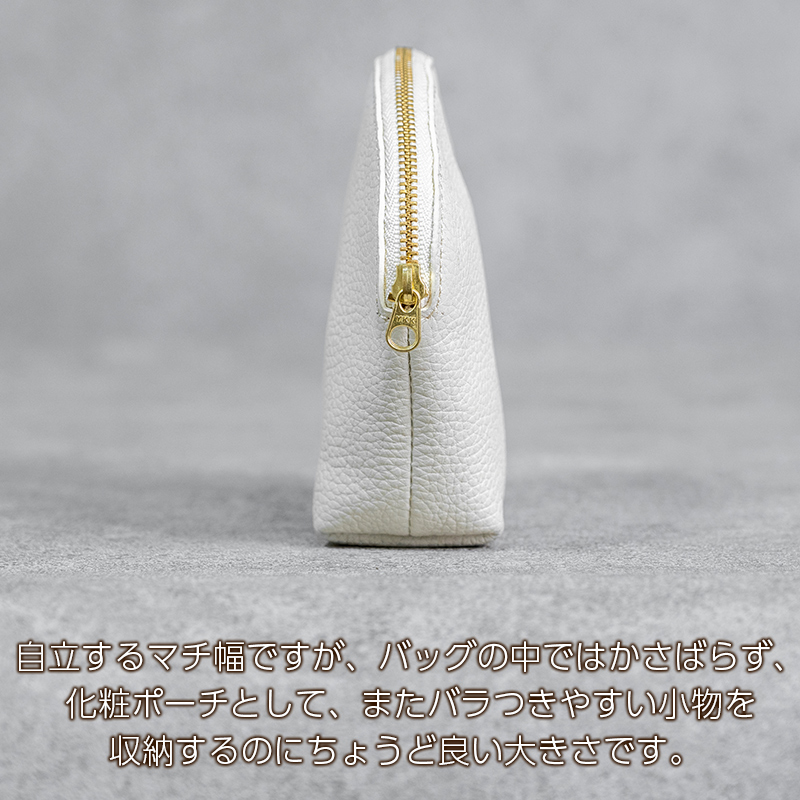 自立するマチ幅ですが、バッグの中ではかさばらず、化粧ポーチとして、またバラつきやすい小物を収納するのにちょうど良い大きさです。