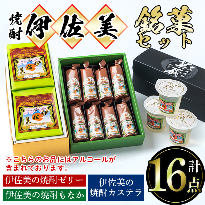 一升瓶のパッケージの焼酎もなか、ほんのり甘いゼリー、伊佐美をふんだんに振りかけたカステラの全3種類。