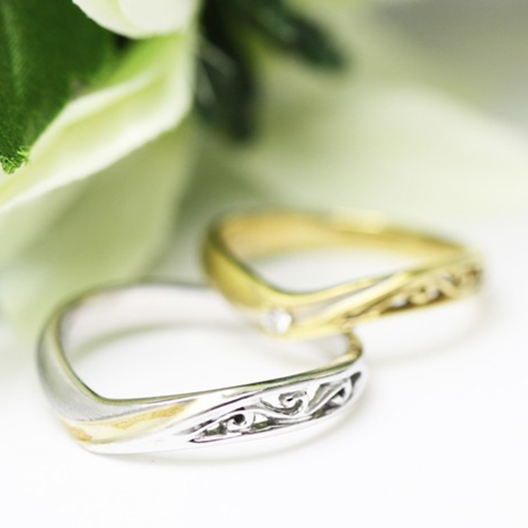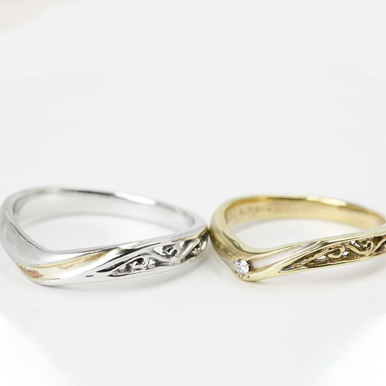 サイドに入っている唐草の透かし彫が個性的です。白K18wgバージョンか、金18ygバージョンか、どちらかをお選びください。価格は1本の値段でどちらも同じになります。