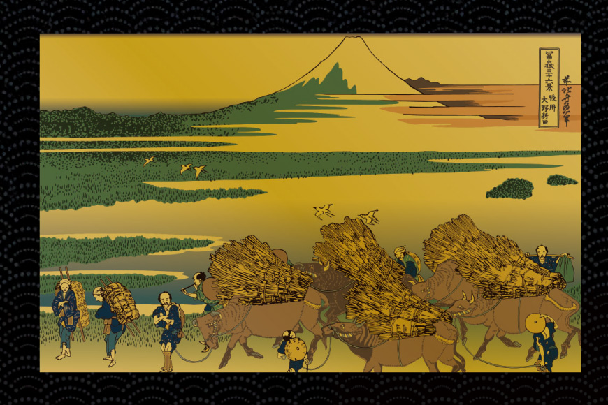 駿州大野新田:干拓された新田の広がりと富士山を対比させ、人の開拓と自然の雄大さを描いた図でございます。