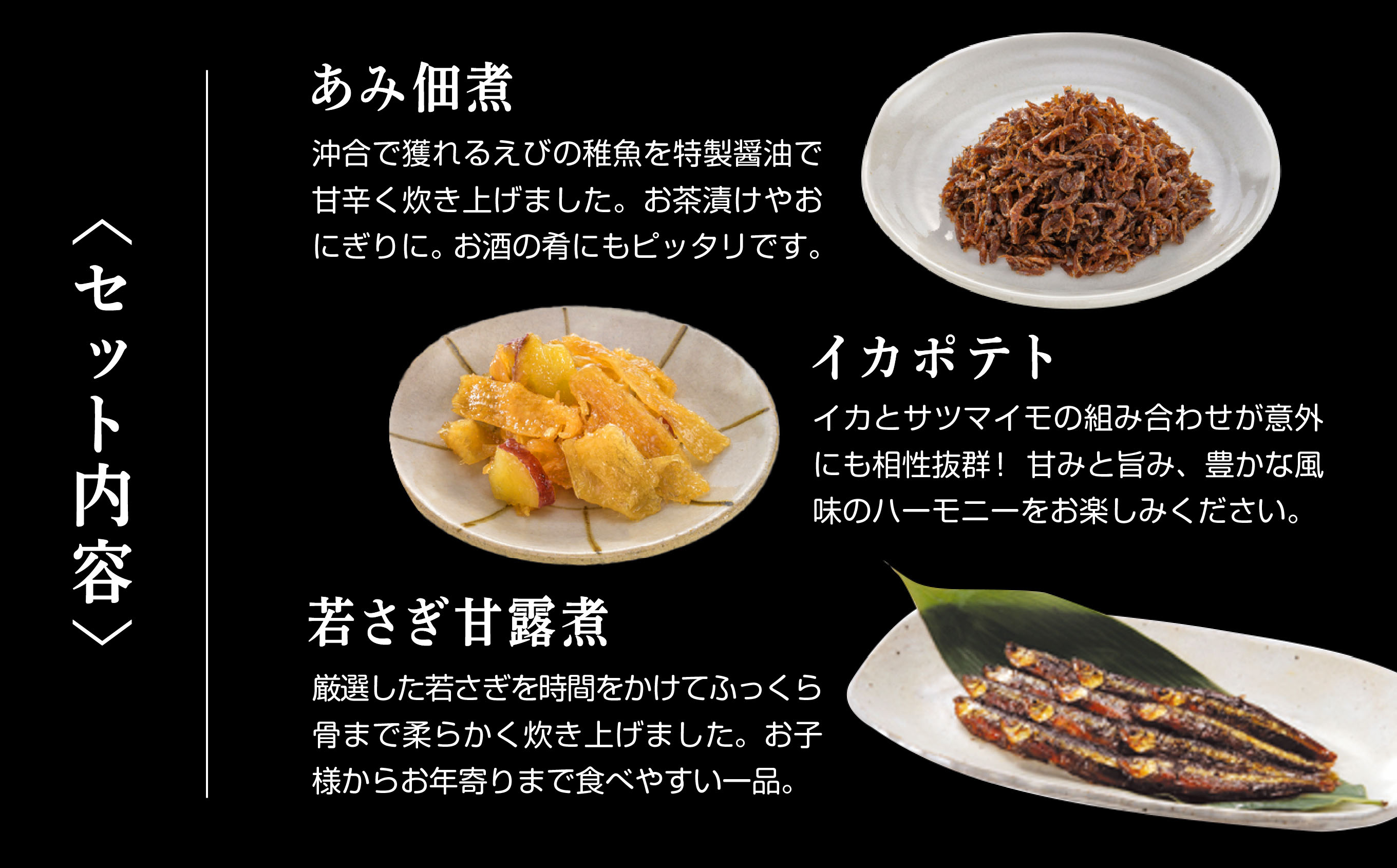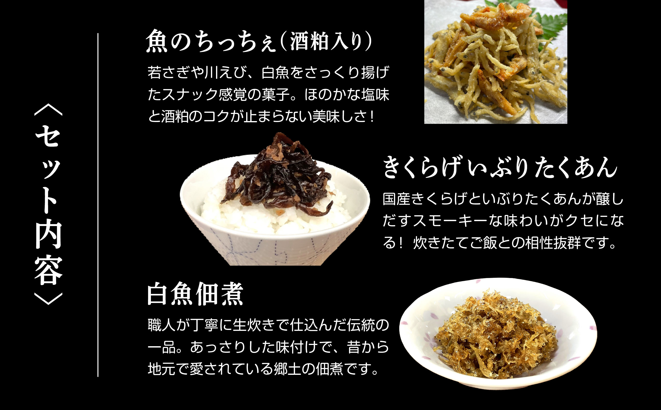 ■あみ佃煮:80g ■イカポテト:90g ■若さぎ甘露煮:80g ■魚のちっちぇ(酒粕入り):40g ■きくらげいぶりたくあん佃煮:100g ■白魚佃煮:70g 各1パック