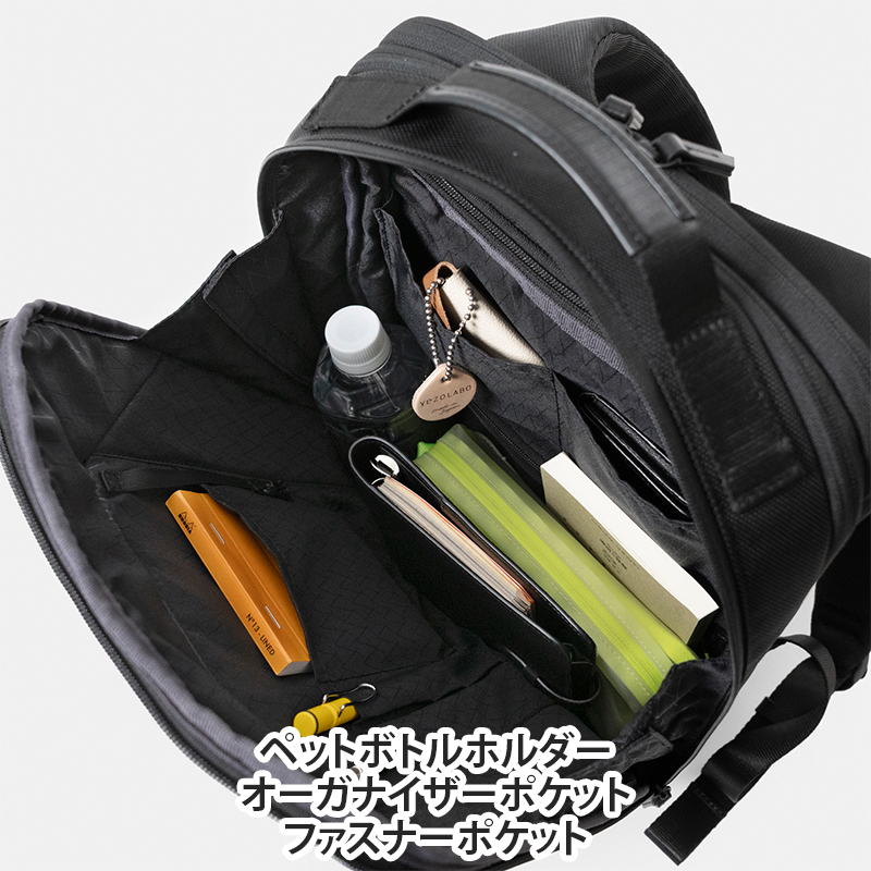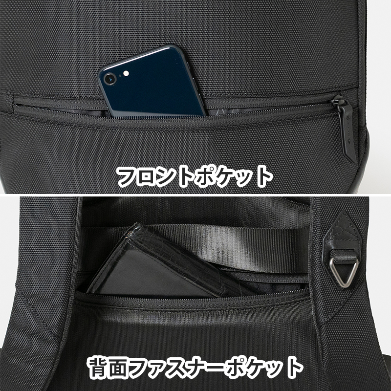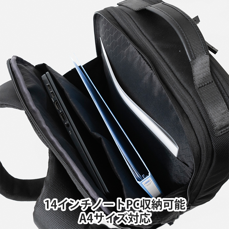 収納口がいずれも大きく開くため、荷物の出し入れが簡単に行えます。背面側の気室は14インチノートPCが収納可能、本体気室はエキスパンダブル機能で荷物の増減に対応します。質感のあるナイロン素材でビジネススタイルにはもちろん、カジュアルなジャケットスタイルなどにも合わせやすく、様々なシーンでお使いいだけます。