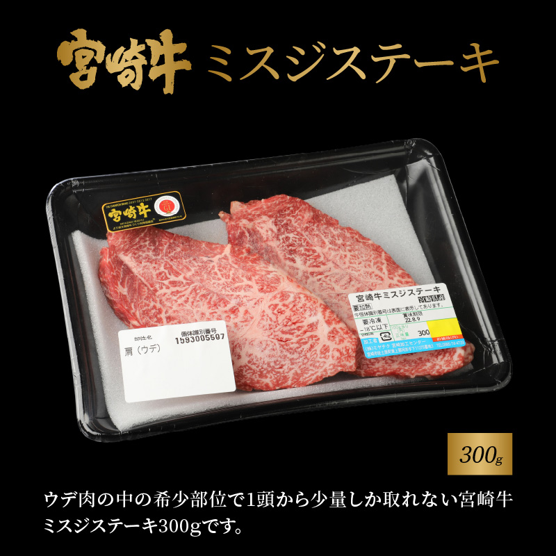 ウデ肉の中の希少部位で1頭から少量しか取れない宮崎牛ミスジステーキ300g、