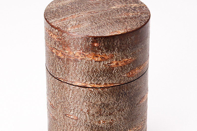筒の表面と内側、蓋と、すべてに桜皮(山桜の樹皮)を使った“総皮づくり”の茶筒です。