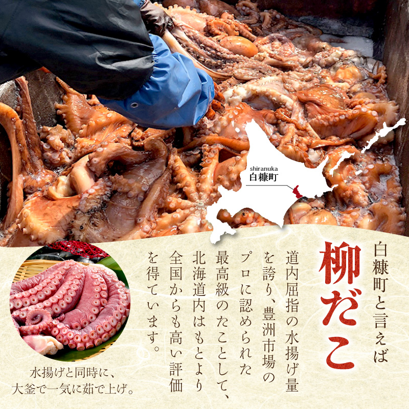 本町は昔からたこ漁が盛んで、豊洲市場のお店では“正月用には白糠の柳だこ”と、