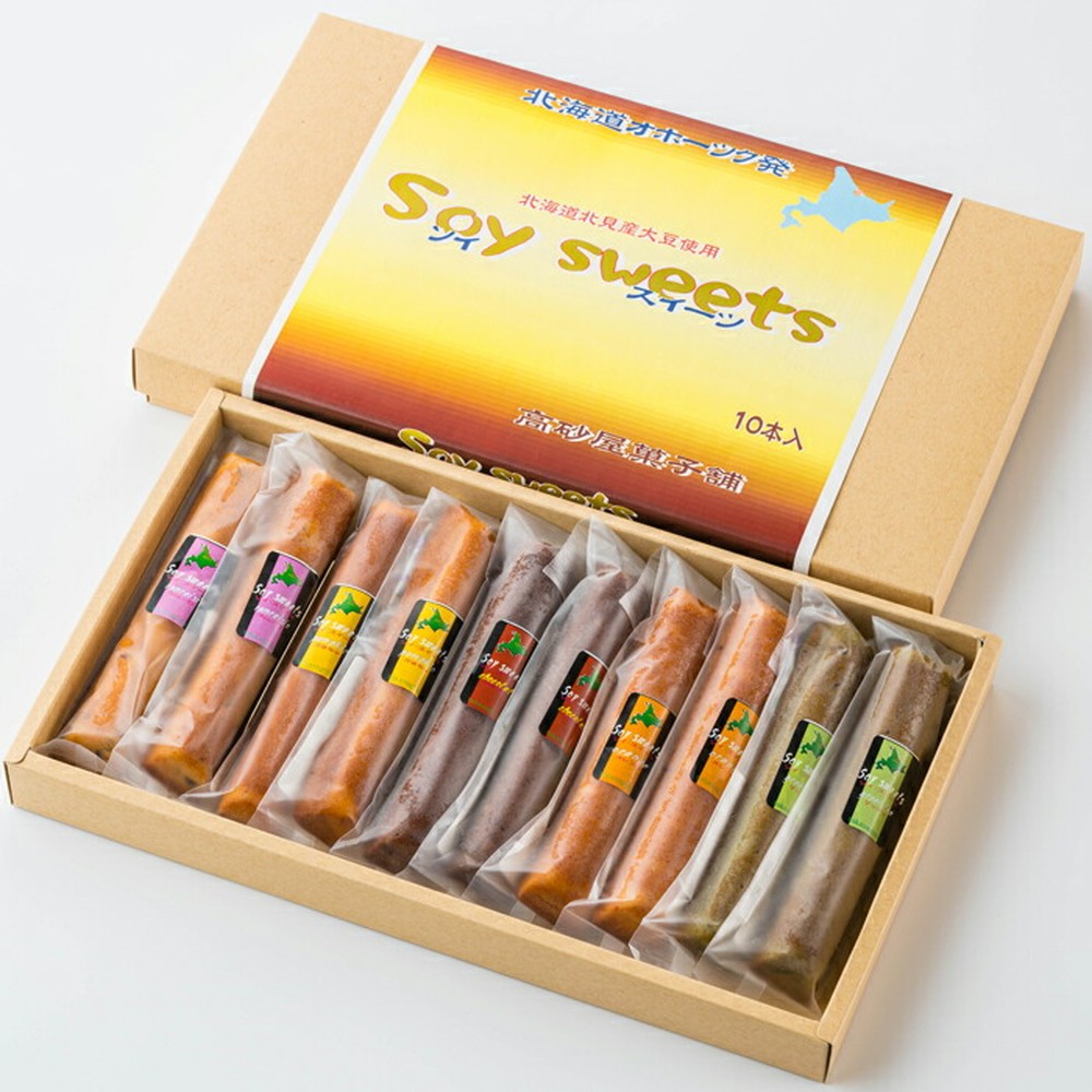 北見産大豆を使ったスティックパンケーキ「ソイスイーツ」の5種類の風味を2本ずつ10本パッケージを2箱セットにしました。