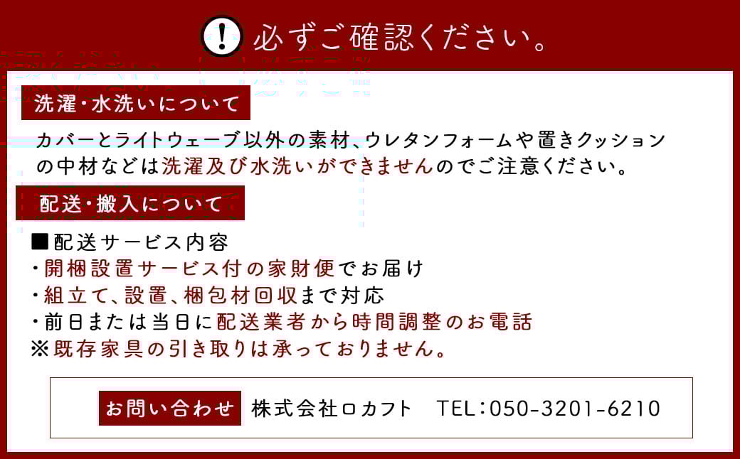 カバーとライトウェーブ以外の素材、ウレタンフォームや置きクッションの中材などは洗濯及び水洗いができませんのでご注意ください