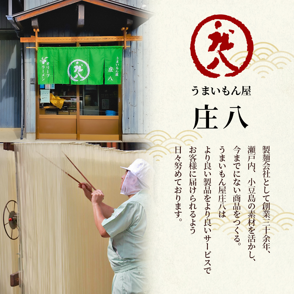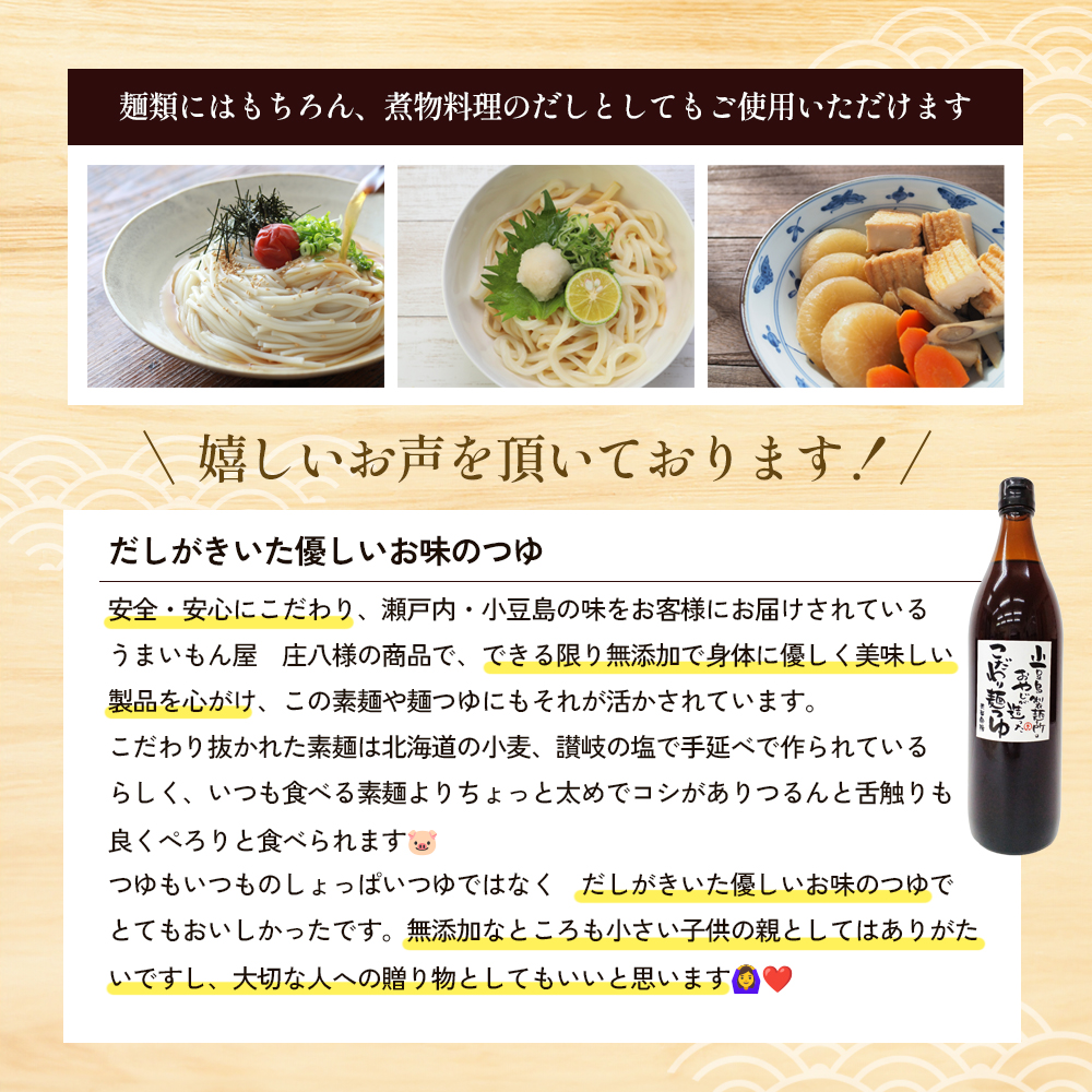 香川県伊吹産いりこ、かつお節、昆布を使用し、小豆島の製麺所庄八が自分の作った麺に合うようにと、自ら改良に改良を重ねて作った自信作のこだわり麺つゆ。