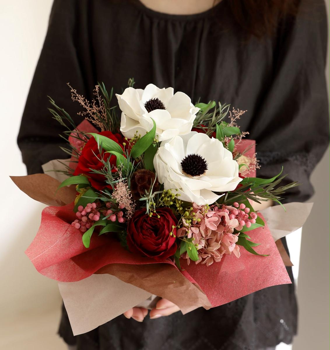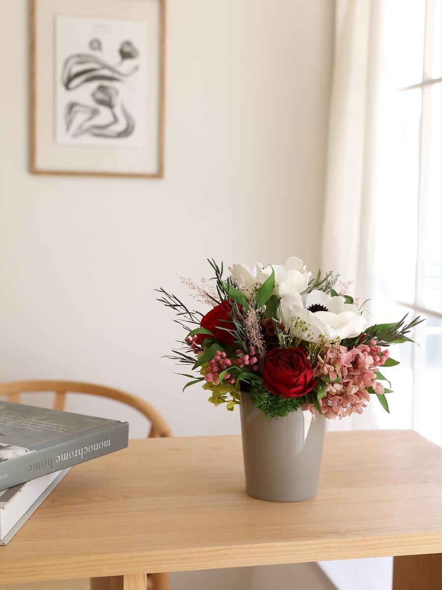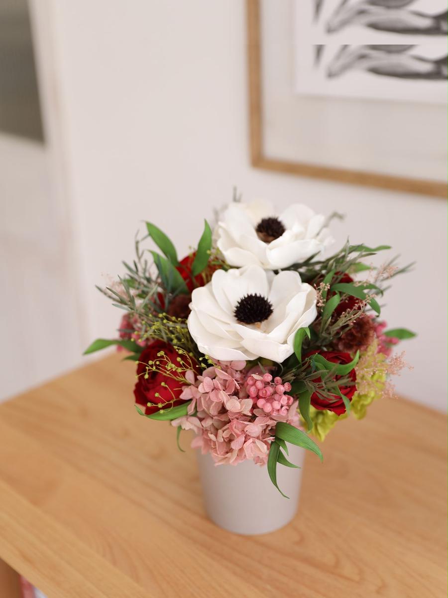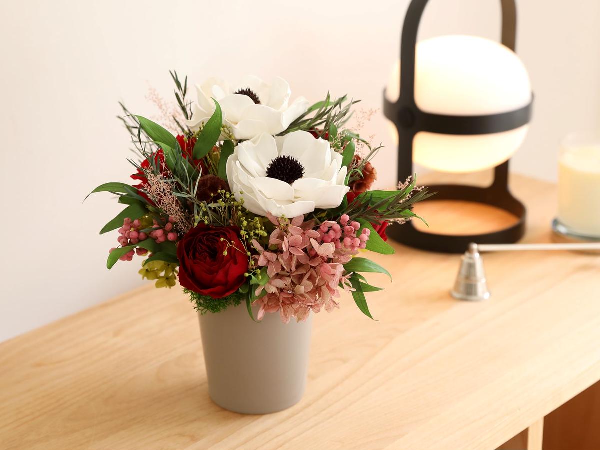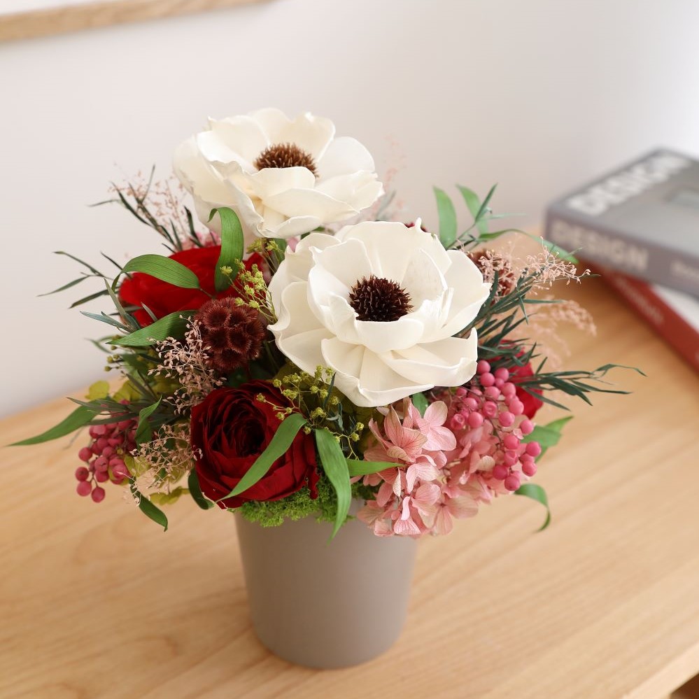 アーティフィシャルフラワーとは異なり一つ一つ形状やカラーが異なるのもリアリティがあり、花径が9cmもある迫力のある花は、とても印象的で、主役にふさわしい存在感です。