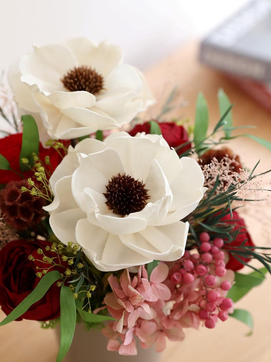 フルールの主役、アネモネはソーラーフラワーを使用しています。ソーラーフラワーとは、ソラの木の皮を薄くむいた芯の部分を乾燥させたものを、ひとつひとつ丁寧に花の形に作り上げたハンドメイドフラワー。