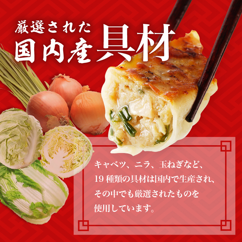 国内産の厳選されたキャベツ、ニラ、玉ねぎなど19種類の具材を加えています。