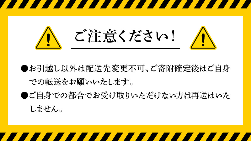 ・事業者から返礼品発送後、台風・豪雨・降雪等の気象状況や地震等による物流への影響でご指定日時より遅れが生じ、返礼品を受け取れなかった場合の再送は致しかねますので、ご了承ください。