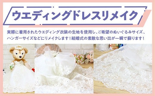 思い出の詰まったドレスをなかなか処分できず保管されてませんか?捨てられずにしまい込んだ大切な思い出が詰まったウエディングドレスを、お気に入りのぬいぐるみサイズなどにリメイクして、ずっと身近に置いておくことができます。一目見て一瞬で思い出が蘇るように、1着1着バランスよく心をこめてリメイクいたします。実際に着用されたウエディング衣装をお送り頂き、その生地を使って、ご希望のぬいぐるみサイズ、ハンガーサイズなどにリメイクいたします。高い技術を持った職人が1着1着心をこめて、ドレスに詰まった思い出が「カタチ」になるようにリメイクします。
