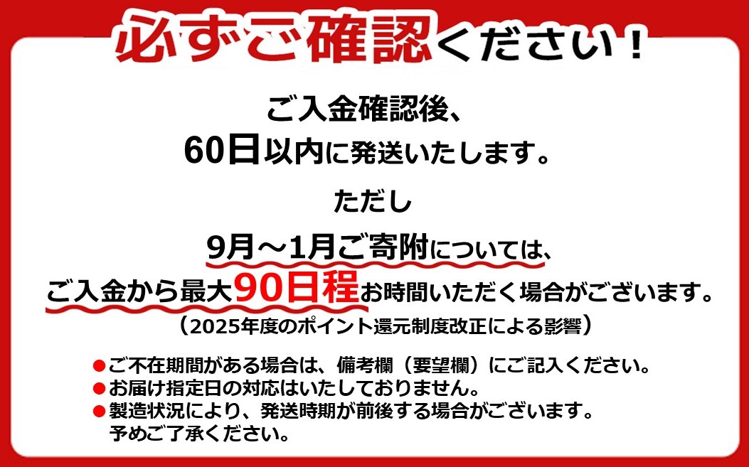ご入金確認後、60日以内に発送いたします。