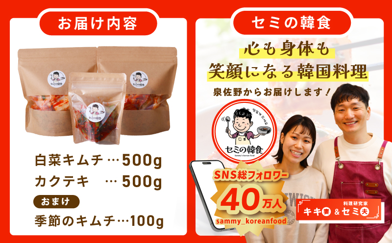 白菜キムチ(500g)、カクテキ(500g)、おまけ季節のキムチ(100g)