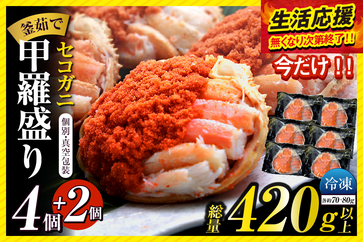 〈DayDay./キメツケで紹介!〉【セコガニ 釜茹で 甲羅盛り 約70~80g(甲羅含む)×6個 総量420g以上 冷凍】在庫なくなり次第終了!【令和8年3月上旬以降発送予定】生活応援! TVで紹介 日本テレビ カンテレ 本場 香住産 内子 外子 蟹身 かにみそ 香住 柴山 海鮮 国産 かに カニ 蟹 松葉がに メス せこがに 大人気 おすすめ 返礼品 ふるさと納税 兵庫県 香美町 日本海フーズ 07-17-[07-17]