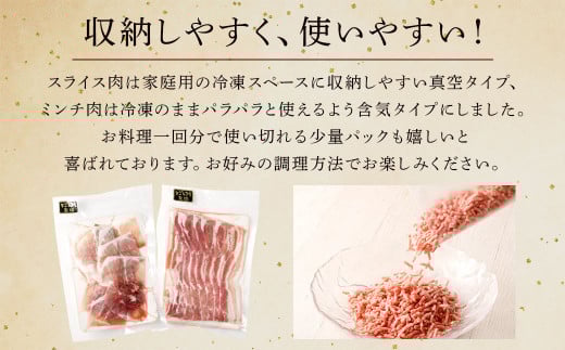 スライス肉は家庭用の冷凍スペースに収納しやすい真空タイプ、ミンチ肉は冷凍のままパラパラと使えるよう含気タイプにしました。
