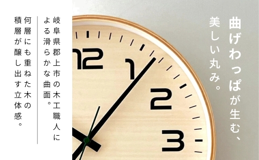 日本の伝統工芸「曲げわっぱ」をフレームに使用しスッキリとしたフォルムの掛け時計です。