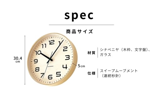 - plywood clock 23 (付属品:取扱説明書、保証書、単3電池、壁掛け用木ネジ) サイズ:Φ304×50mm 重量:800g 材質:シナベニヤ(木枠、文字盤)、ガラス 仕様:スイープムーブメント(連続秒針) ※こちらの製品は電波時計ではありません。 時刻合わせ:手動 色:ナチュラル