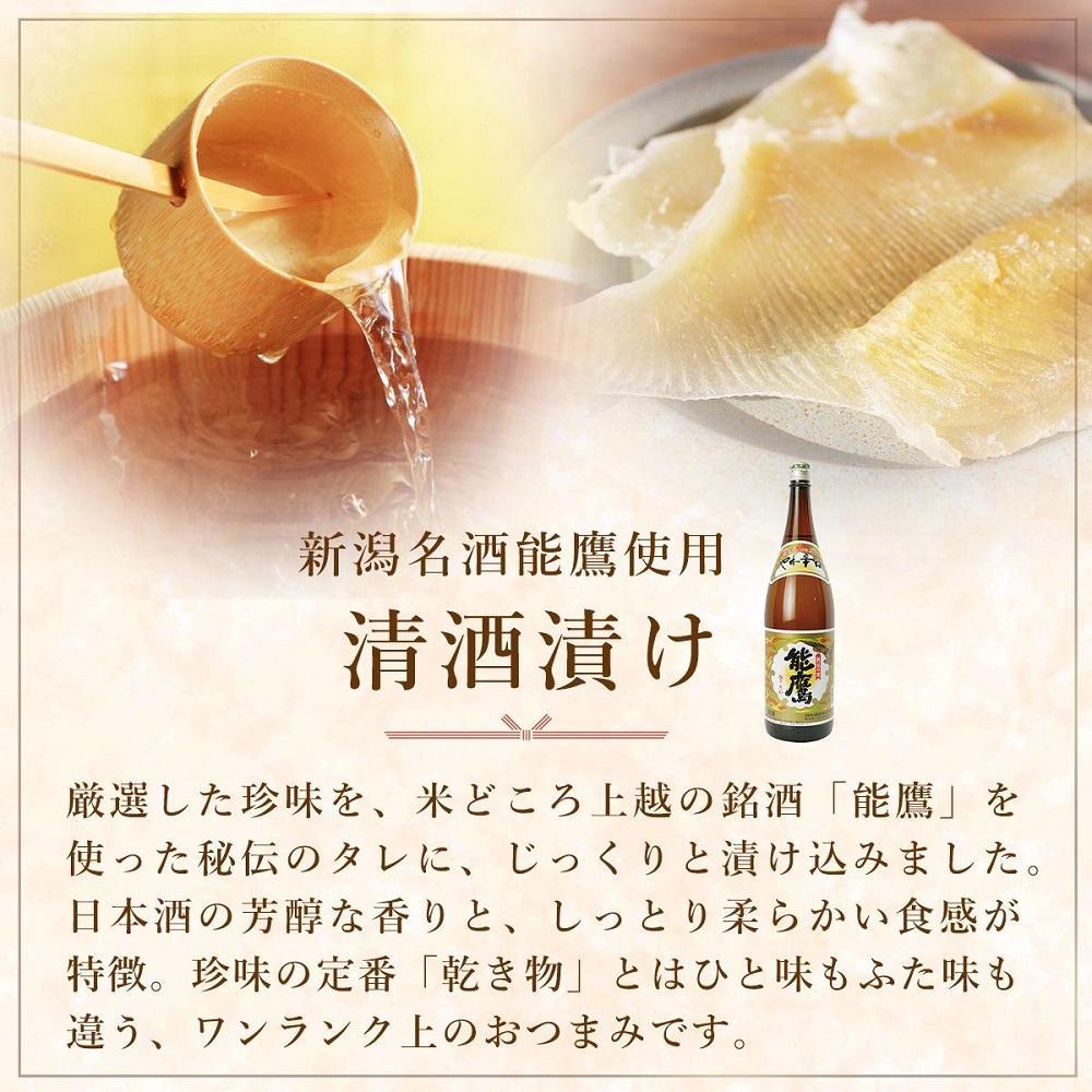 上越の上質なお酒を使用した特製のタレに、海産物乾燥珍味をじっくり漬け込んだしっとりやわらかなオリジナル珍味を「越後上酒漬け珍味」と名付けました。