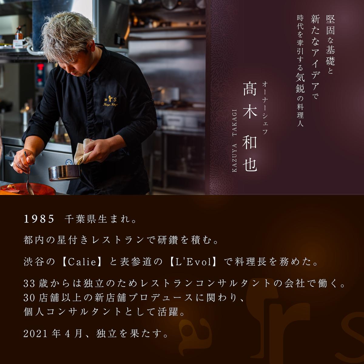 西麻布の【L'Effervescence】で部門シェフ、新橋の【Restaurant La FinS】でスーシェフなど、都内の星付きレストランで研鑽を積む。