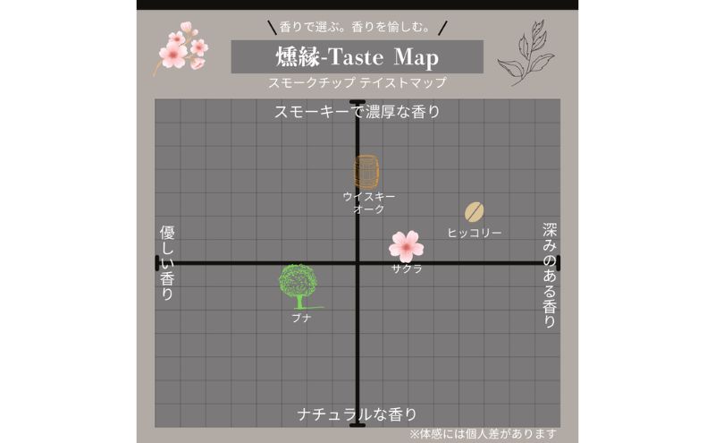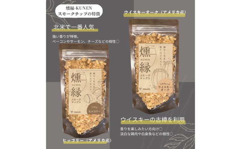 こちらのスモークチップ燻縁は、香りの個性が際立つ2種の燻製木材チップを厳選。 甘み、深み、スモーキーなど食材に合わせて“香りを選ぶ”楽しさを。 自宅で、キャンプで、あなた好みの味と香りがきっと見つかる。