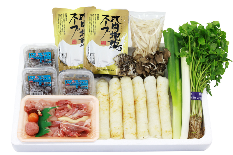 ■内容量:きりたんぽ 80g×6本、比内地鶏スープ 200g×2袋、ささがきゴボウ 60g、せり 80g、長ネギ 100g、舞茸 100g、鶏肉220g、じゅんさい 60g×3パック(自社オリジナルゆずダレ付)