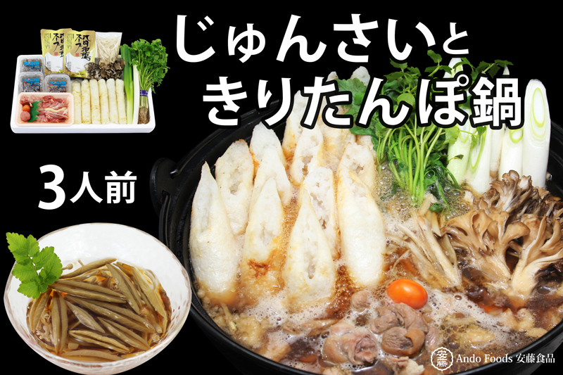 きりたんぽ、スープ、具材、全て揃ったきりたんぽ鍋にカップ入じゅんさいも付いたセットです。