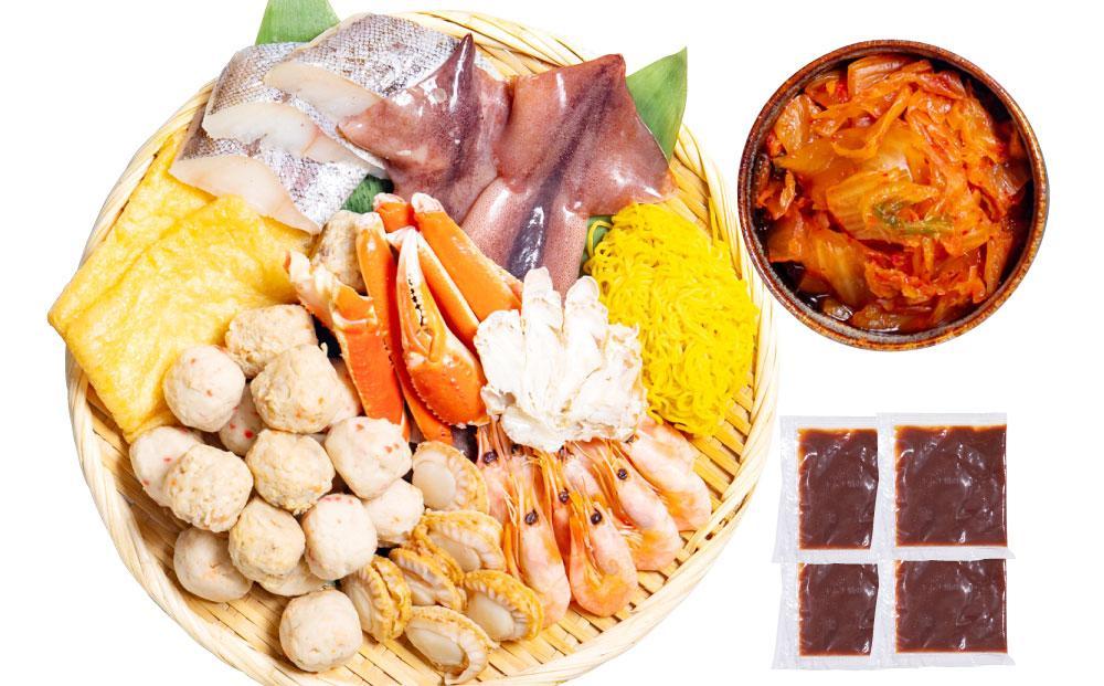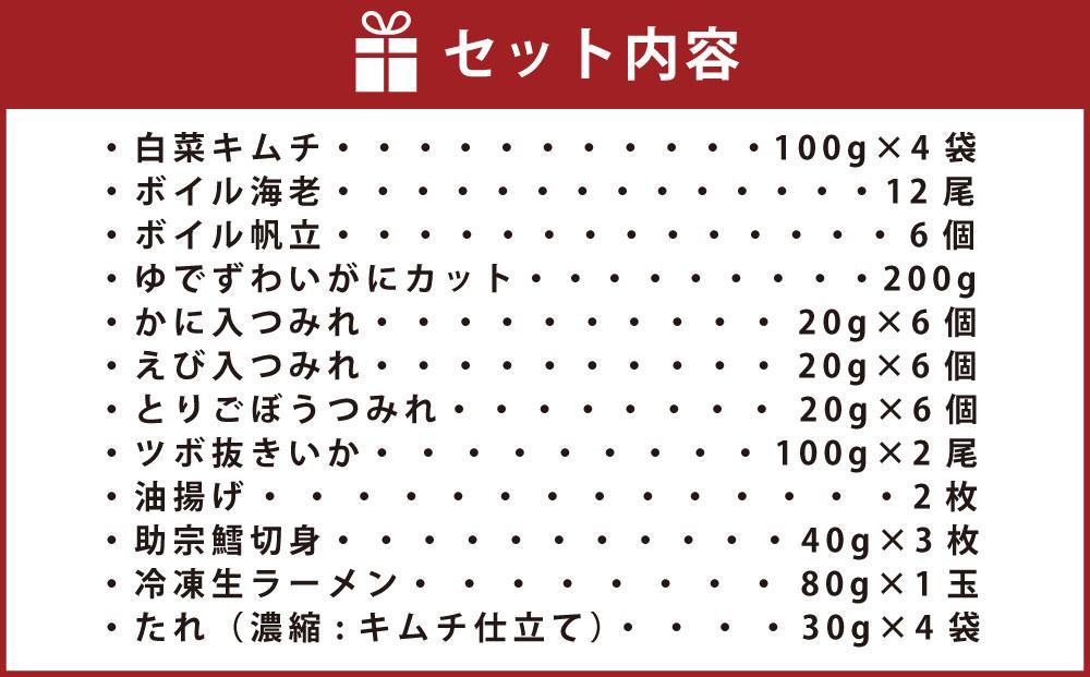 本場韓国の白菜キムチを使い、多彩な魚介を詰め合わせました。ピリ辛の「キムチ鍋」でお召し上がりください。