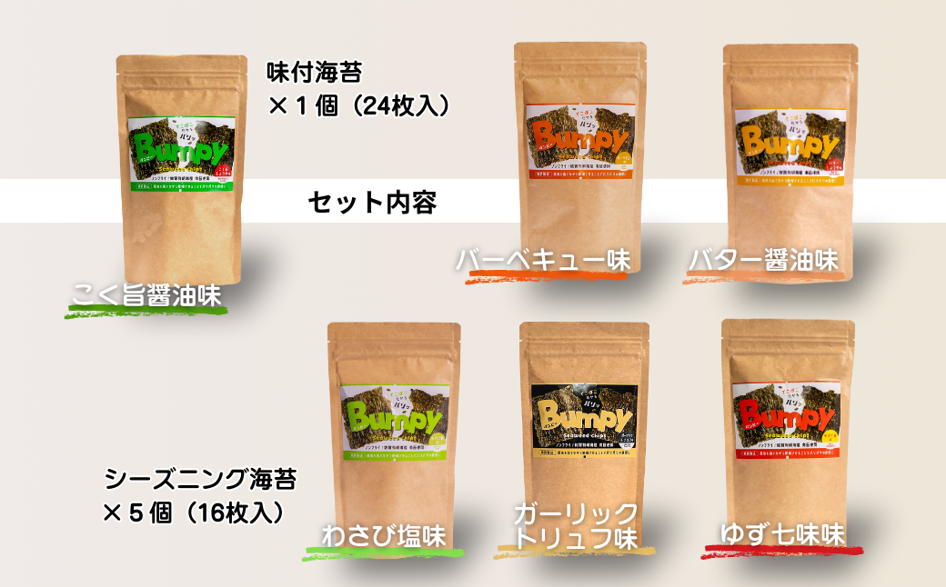 シーズニング海苔(バーベキュー味):乾のり(佐賀有明海産)、 砂糖(国産製造)、醤油、たんぱく加水分解物、発酵調味料、食塩、みりん、エビ、昆布エキス(昆布、豚肉)、でんぷん分解物、かつお削り節、魚醤、酵母エキス、しいたけ/調味料(アミノ酸等)、甘味料(甘草、ステビア)、香辛料抽出物、粉末醤油ベーコン風味調味料、ビーフパウダー、乾燥にんにく、加工油脂、レモン果汁パウダー、乾燥玉ねぎ、(一部に大豆・小麦・豚肉・乳成分・エビを含む)