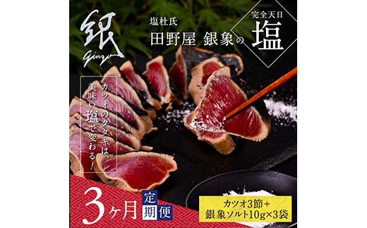 〈カツオのたたき×3節(鰹の大きさには個体差があり、1節約320g360g以上でお送り致します。)、田野屋銀象 天日塩10g×3袋、たたきのタレ15ml×3袋、おろしニンニク2g×3袋〉×3ヵ月