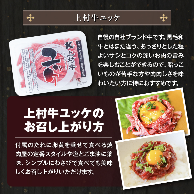 ISO22000認証取得の生食認定自社工場で製造された安全・安心の上村牛ユッケ。