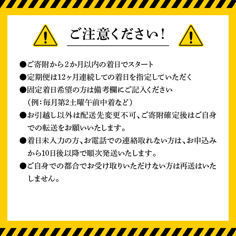 ・事業者から返礼品発送後、台風・豪雨・降雪等の気象状況や地震等による物流への影響でご指定日時より遅れが生じ、返礼品を受け取れなかった場合の再送は致しかねますので、ご了承ください。