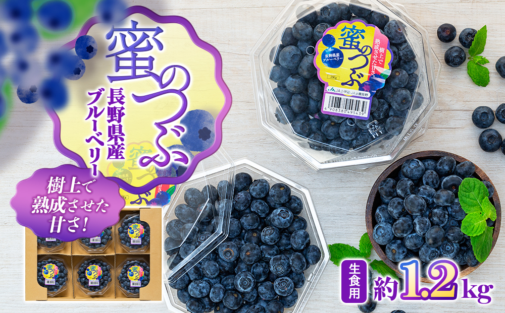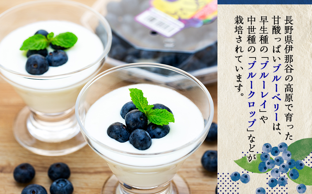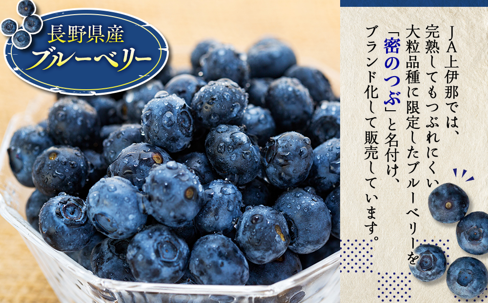 伊那谷の高原で育った甘酸っぱいブルーベリーは、早生種の「ブルーレイ」や中世種の「ブルークロップ」などが栽培されています。JA上伊那では、完熟してもつぶれにくい大粒品種に限定したブルーベリーを「密のつぶ」と名付け、ブランド化して販売しています。