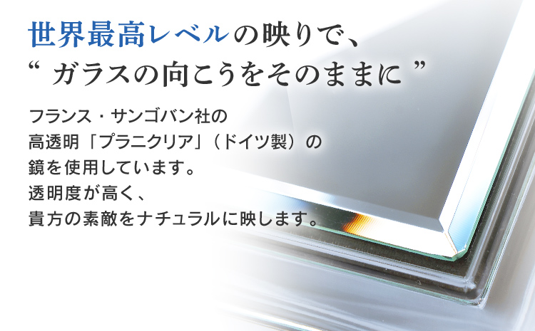 350年の歴史を持つ老舗メーカー、フランス・サンゴバン社の高透明鏡を九鏡にて防湿加工を施した鏡です。