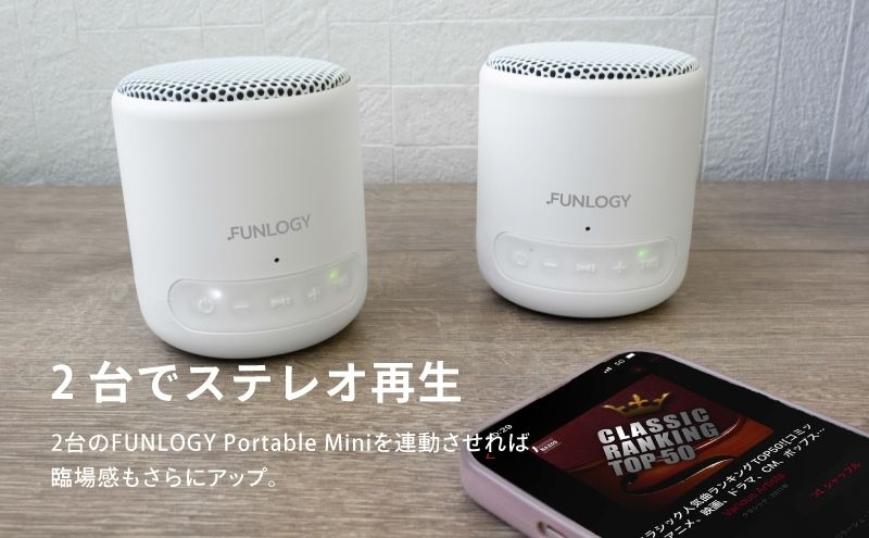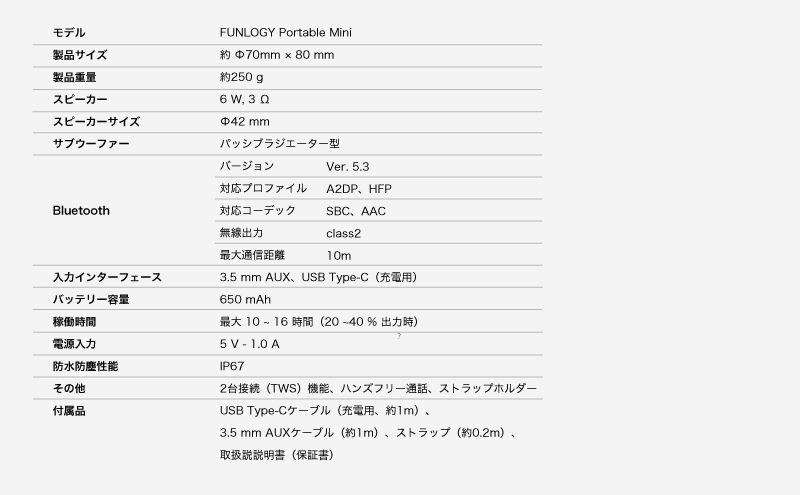 FUNLOGY Portable Mini 1台(white)、USB Type-Cケーブル(充電用、約1m)、3.5 mm AUXケーブル(約1m)、 ストラップ(約0.2m)取扱説説明書(保証書)