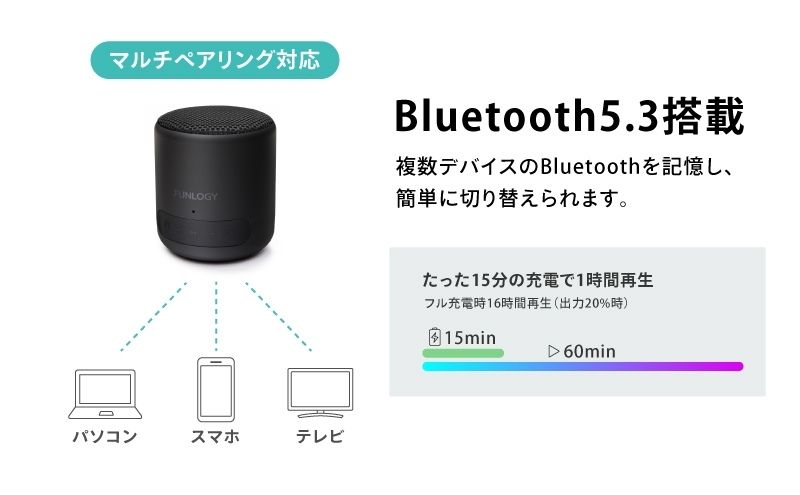 また、有線接続も可能で、付属のAUXケーブルを使用して、有線スピーカーとしてもご利用いただけます。Bluetooth環境がない機器とも簡単に接続でき、AUXケーブルは他のものでもお使いいただけます。