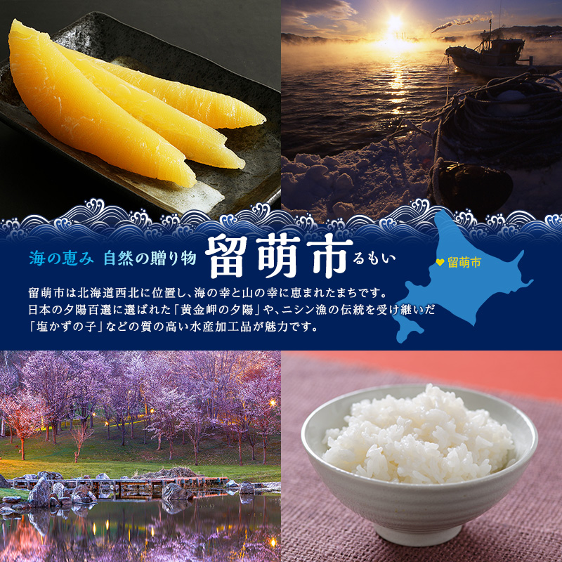 また、かつてニシン漁で栄えた伝統を受け継ぎ、日本一の加工生産量を誇る「塩かずの子」などの質の高い水産加工品や、全国食味分析鑑定コンクール連続金賞の「ななつぼし」をはじめとした良質な南るもい米といった、海の幸・山の幸に恵まれています。